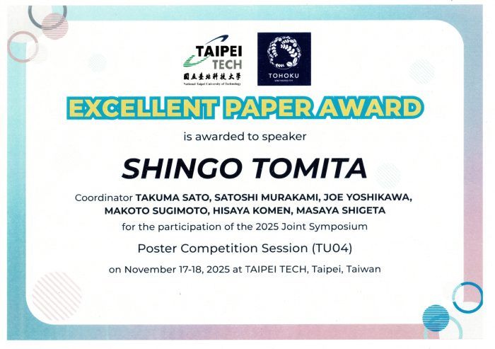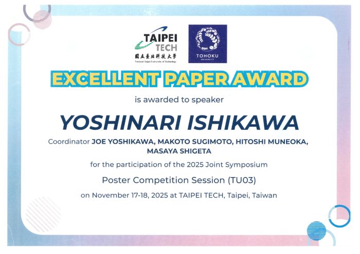 富田 慎吾さん(茂田・杉本/宗岡研究室 D1)、石川 芳成さん(茂田・杉本/宗岡研究室 M2)がTaipei Tech & Tohoku University (School of Engineering) 2025 Joint Symposiumにおいて Excellent Paper Awardを受賞しました。